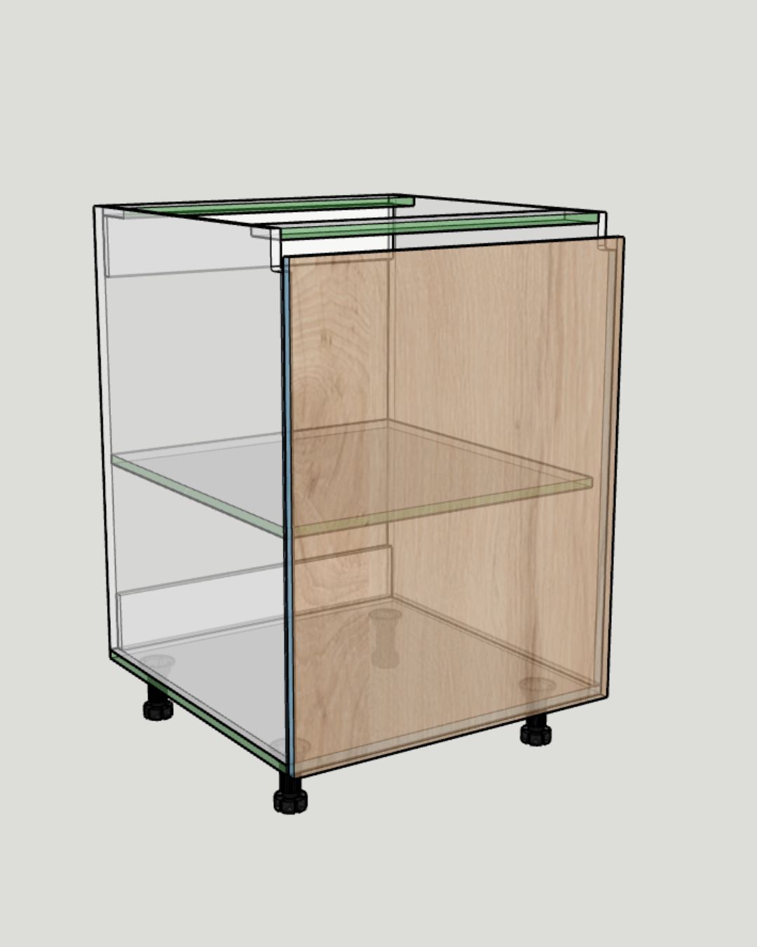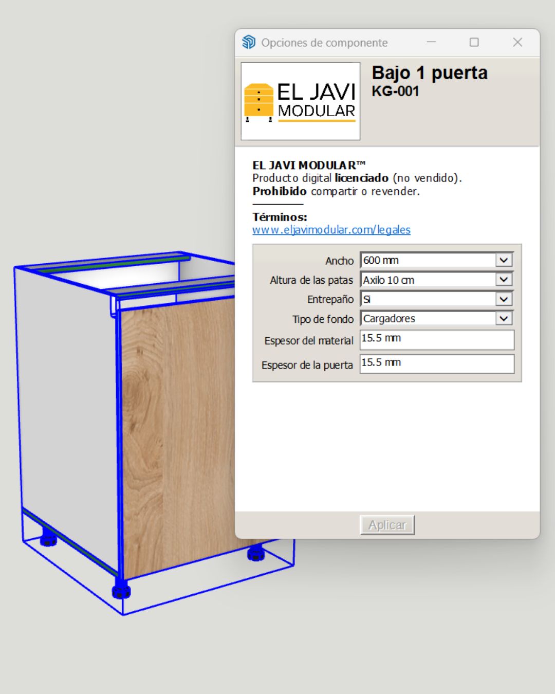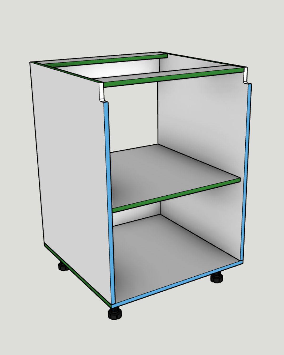 La mayoría de los errores de mecanizado en sistemas de apertura por perfil Gola ocurren en este componente exacto: el bajo de una puerta. Como es la pieza que más vas a repetir en tu producción, un cálculo incorrecto de las fugas de puerta te costará caras horas de reproceso en taller. El KG-001 no es un simple dibujo 3D, es geometría construida para fabricación (DFM). Hemos estandarizado la matemática para que el ancho responda de forma paramétrica entre 300 y 600 mm, asegurando que las bisagras de cobertura de 35mm actúen perfectamente sin bloqueos ni colisiones. Más importante aún, el módulo ajusta automáticamente las alturas del casco dependiendo si usas patas Häfele Axilo de 100 o 150 mm. Su integración total con OpenCutList (OCL) aplica el color del canto frontal basado en el material de la puerta de forma condicional, logrando ese acabado "premium" sin intervención manual. Ahorra 15 minutos de despiece por cada caja que fabriques.