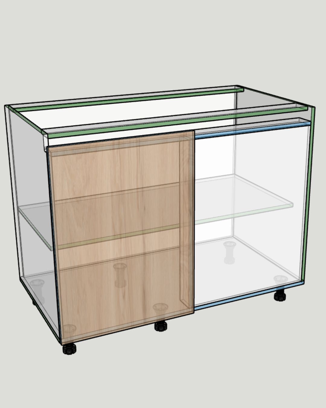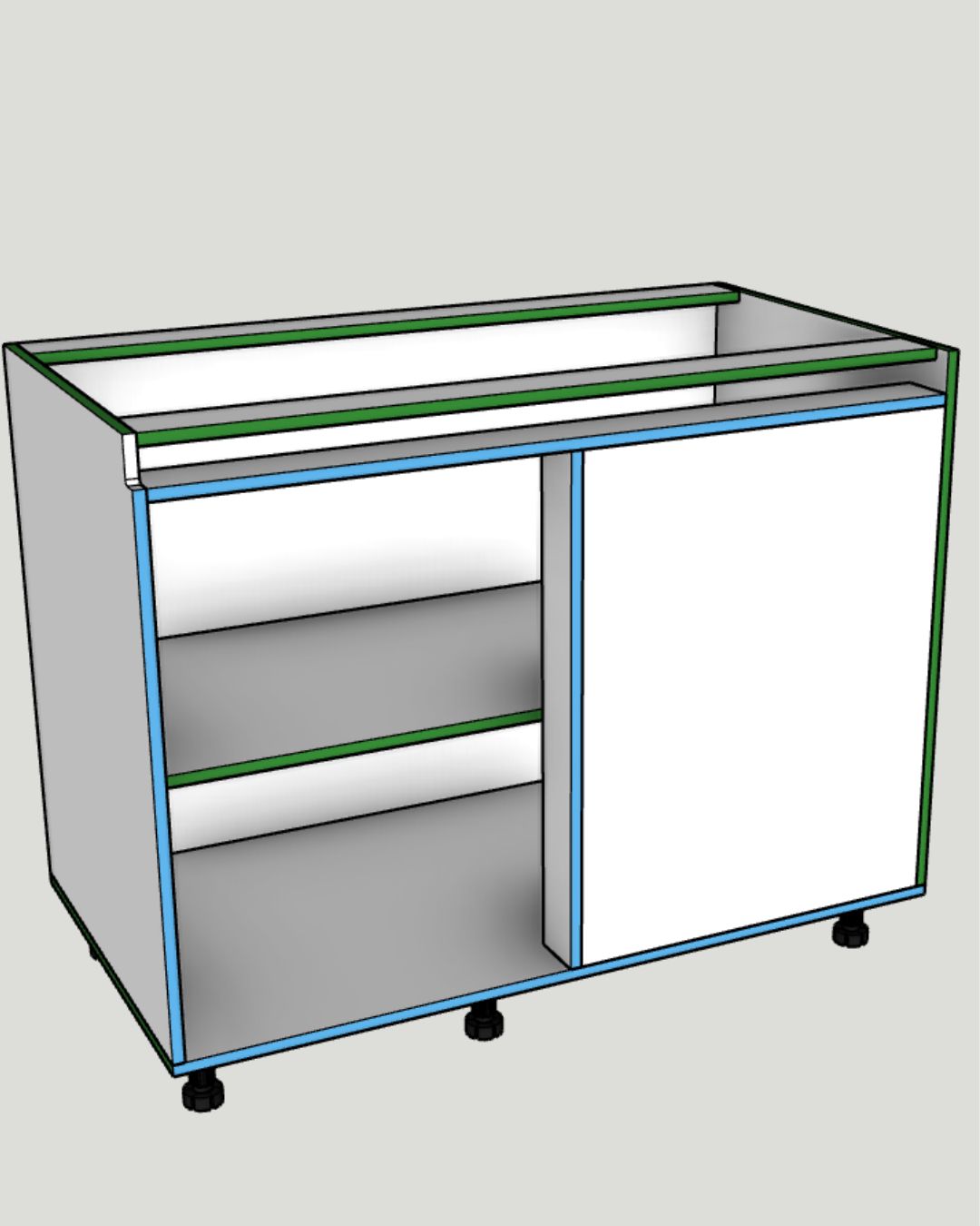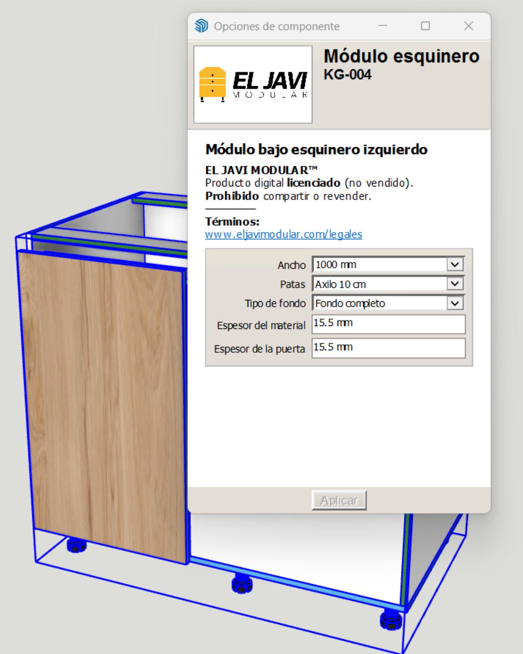 La esquina de una cocina siempre es un cuello de botella en manufactura. Los cálculos manuales del perfil Gola en un módulo ciego son propensos a errores, y cuadrar herrajes de extracción total a menudo resulta en choques entre puertas o pérdida de garantía. El KG-004 automatiza la matemática del módulo esquinero izquierdo. Es paramétrico desde 850 mm hasta 1100 mm en incrementos precisos de 50 mm. Diseñado en base a tolerancias reales de herrajes: a los 1000 mm absolutos, el módulo está calibrado y validado para alojar el extraíble tipo "LeMans" ("Cacahuate") de la marca Häfele o Cerrajes sin ningún conflicto de montaje. Además te da versatilidad estructural extrema: ajusta tener fondo completo o con cargadores para optimizar tablones de melamina, elige el tipo de patas e independiza los espesores tanto de casco como de puerta. Al empujar la información a OpenCutList, los cubrecantos ya van preasignados según el material exterior para agilizar la orden de corte.